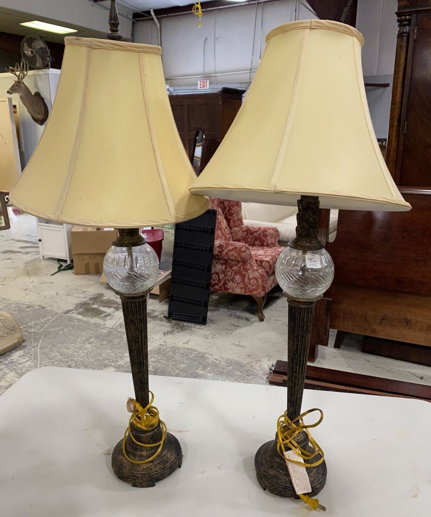 Pair of Metal and Glass Lamps, with shades, 35"h. Location 4th Row Pair of Metal and Glass Lamps, with shades, 35"h. Location 4th Row