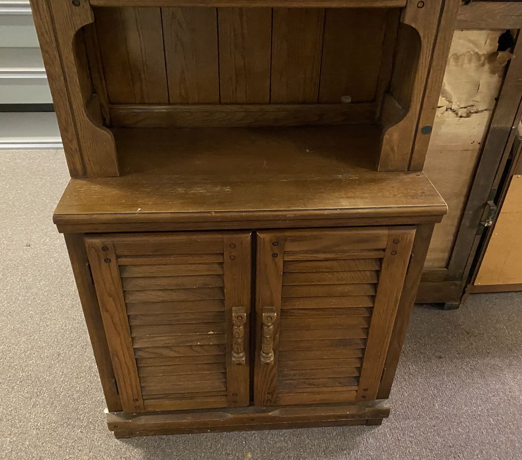 Vintage Young Hinkle Oak Hutch Cabinet, two piece, two door, top with shelves, 77"h., 30"w., 18"d. Location 6th Row Vintage Young Hinkle Oak Hutch Cabinet, two piece, two door, top with shelves, 77"h., 30"w., 18"d. Location 6th Row