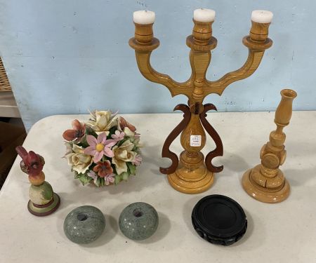 Group of Assorted Porcelain, Marble, and Wooden Candle Holders. Include Porcelain Flower Bouquet, Bird Figurine, 2 Marble Candle Holders, 1 Wooden Candle Holder, Swedish Wooden Three Arm Candle Holder, and Wooden Vase Stand Group of Assorted Porcelain, Marble, and Wooden Candle Holders. Include Porcelain Flower Bouquet, Bird Figurine, 2 Marble Candle Holders, 1 Wooden Candle Holder, Swedish Wooden Three Arm Candle Holder, and Wooden Vase Stand