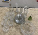 688 Group of Assorted Glassware Includes 7 Sundae Cups, 3 Flower Vases, Fruit Bowl, 8 Plates, Bell, and Decanter