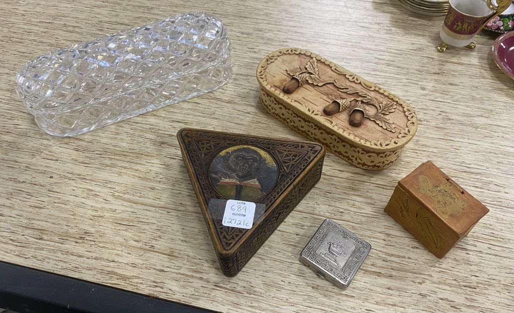 689 Group of Assorted Carved Wooden Boxes and Covered Candy Dish