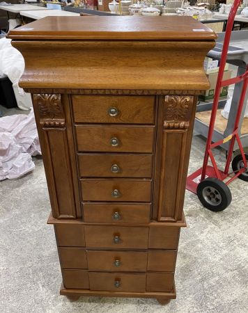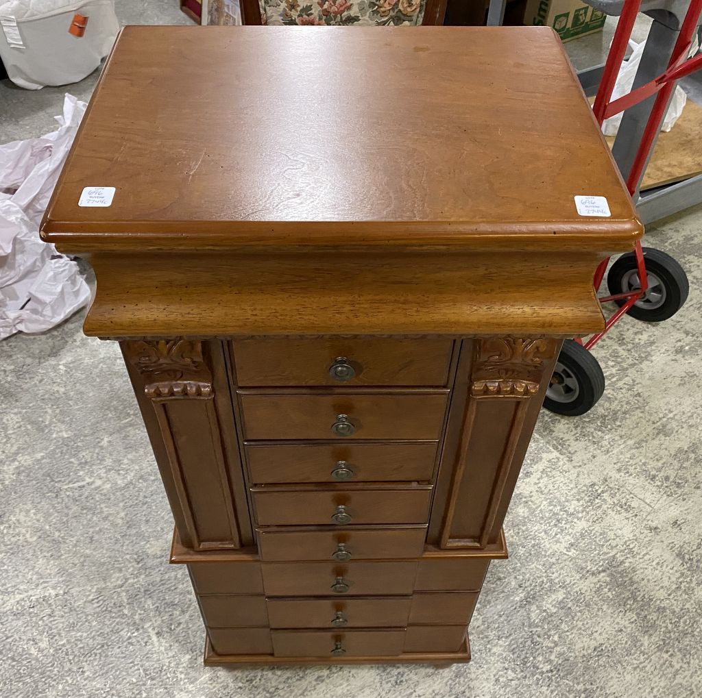 Cherry Jewelry Armoire, divided shelves, good condition, 42"h., 19"w., 14"d. Location 6th Row Cherry Jewelry Armoire, divided shelves, good condition, 42"h., 19"w., 14"d. Location 6th Row