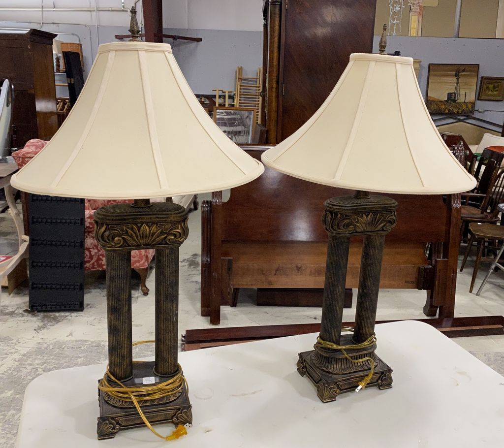 Pair of Metal Column Style Lamps, with shades, 35"h. Location 5th Row Pair of Metal Column Style Lamps, with shades, 35"h. Location 5th Row