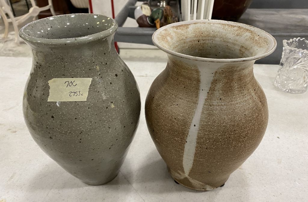 Two Hand Crafted Stoneware Pottery, signed, 9"h. Two Hand Crafted Stoneware Pottery, signed, 9"h.