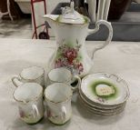 Porcelain Chocolate Set, pitcher, four cups and saucers, floral design. Porcelain Chocolate Set, pitcher, four cups and saucers, floral design.