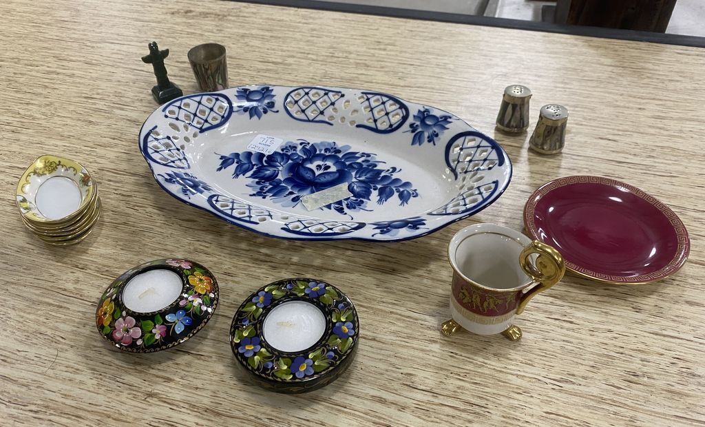 Group of Assorted Porcelain Includes Platter, Candles, Salt and Pepper Shaker, Noritake Butter Dishes, and Other Misc Items, Location Right Metal Racks Group of Assorted Porcelain Includes Platter, Candles, Salt and Pepper Shaker, Noritake Butter Dishes, and Other Misc Items, Location Right Metal Racks