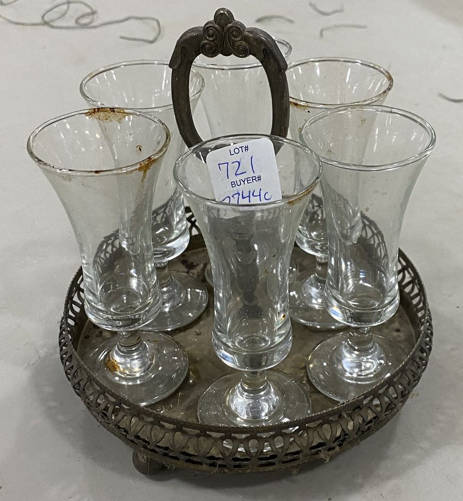 721 6 Unmarked Sherry Glasses with Silvertone Drink Tray
