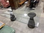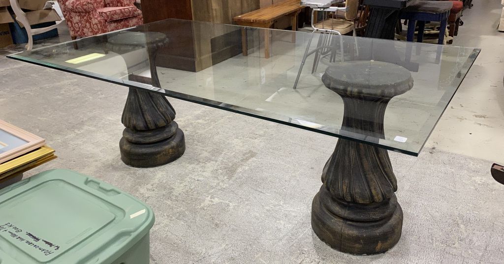 Large Glass Top Dining Table, two pedestal, 29"h., 72"w., 42"d. Location Left Office Large Glass Top Dining Table, two pedestal, 29"h., 72"w., 42"d. Location Left Office