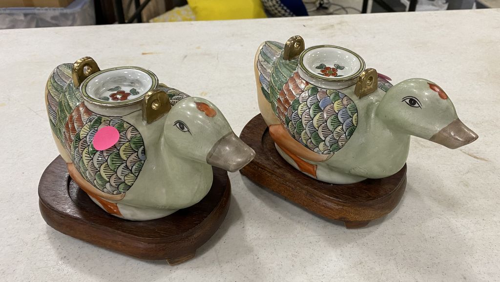 Macau Porcelain Hand Painted Ducks, with lids, wood bases, 8"w Macau Porcelain Hand Painted Ducks, with lids, wood bases, 8"w