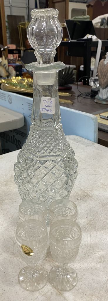 Vintage Diamond Point Liquor Decanter and 4 Cordial Glasses. 14.5"h. Location Right Metal Racks Vintage Diamond Point Liquor Decanter and 4 Cordial Glasses. 14.5"h. Location Right Metal Racks