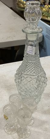 743 Vintage Diamond Point Liquor Decanter and 4 Cordial Glasses