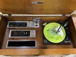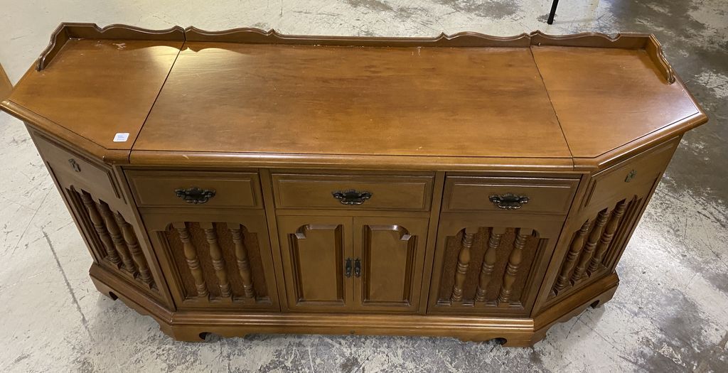 Zenith Radio Cabinet Model F942M, radio and record player, good condition, cherry, untested, on wheels, 28"h., 60"w., 19"d. Location 5th Row Zenith Radio Cabinet Model F942M, radio and record player, good condition, cherry, untested, on wheels, 28"h., 60"w., 19"d. Location 5th Row