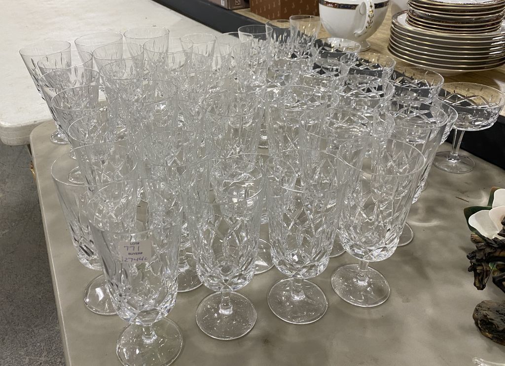 Set of Gorham King Edward Iced Tea Goblets, Champagne Sherbets, Wine Glasses. 24 Goblets, 12 Champagne Sherbets, 7 Wine Glasses. Location Right Metal Racks Set of Gorham King Edward Iced Tea Goblets, Champagne Sherbets, Wine Glasses. 24 Goblets, 12 Champagne Sherbets, 7 Wine Glasses. Location Right Metal Racks