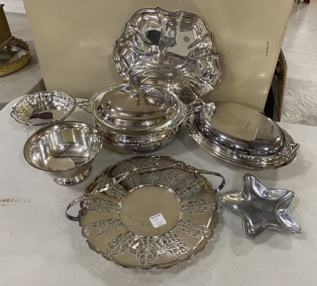 Group of Silver Plate Serving Pieces, vegetable dish, bowls, covered dish, trays, tray with handles, star dish, Location Left Back Metal Middle Shelves Group of Silver Plate Serving Pieces, vegetable dish, bowls, covered dish, trays, tray with handles, star dish, Location Left Back Metal Middle Shelves