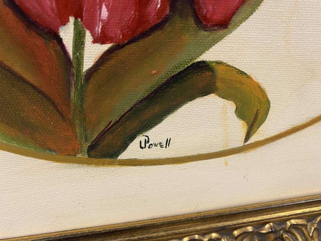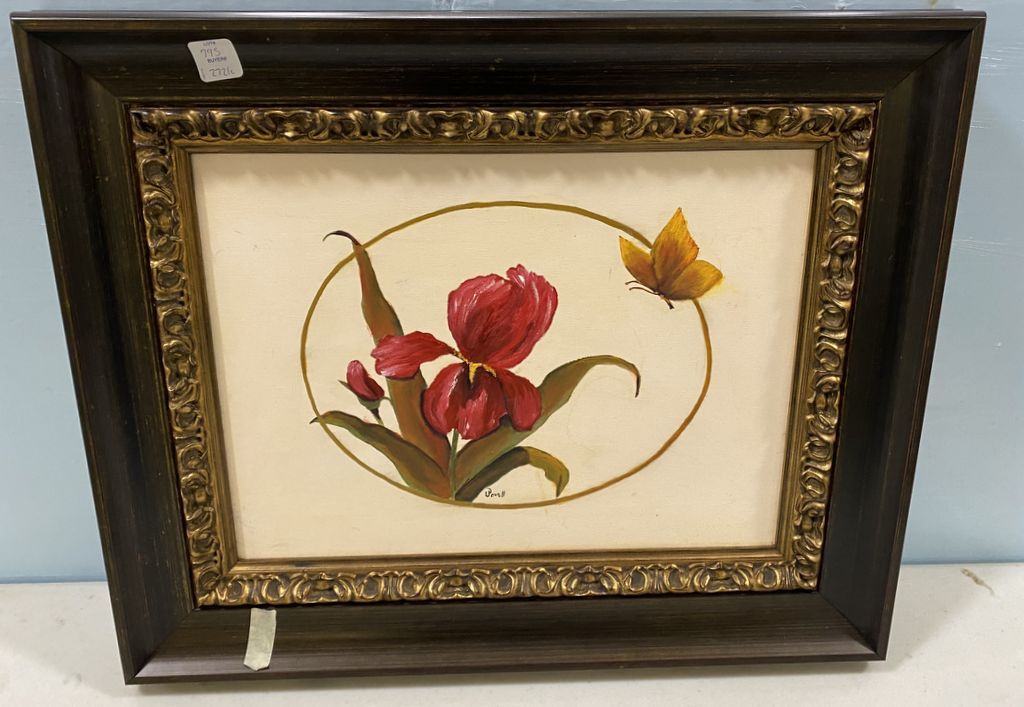 Flower and Butterfly Painting by Powell, on canvas, framed, 18"h., 22"w. Flower and Butterfly Painting by Powell, on canvas, framed, 18"h., 22"w.