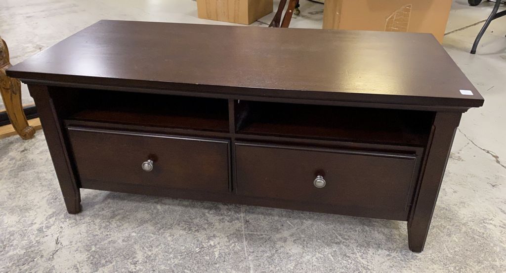 Modern Cherry TV stand, two drawers, 21"h., 48"w. Location 4th Row Modern Cherry TV stand, two drawers, 21"h., 48"w. Location 4th Row