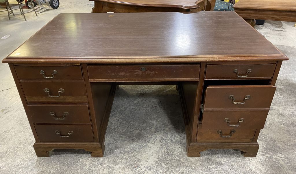 Large Kneehole Office Desk, needs work, 30"h., 56"w. Location 6th Row Large Kneehole Office Desk, needs work, 30"h., 56"w. Location 6th Row