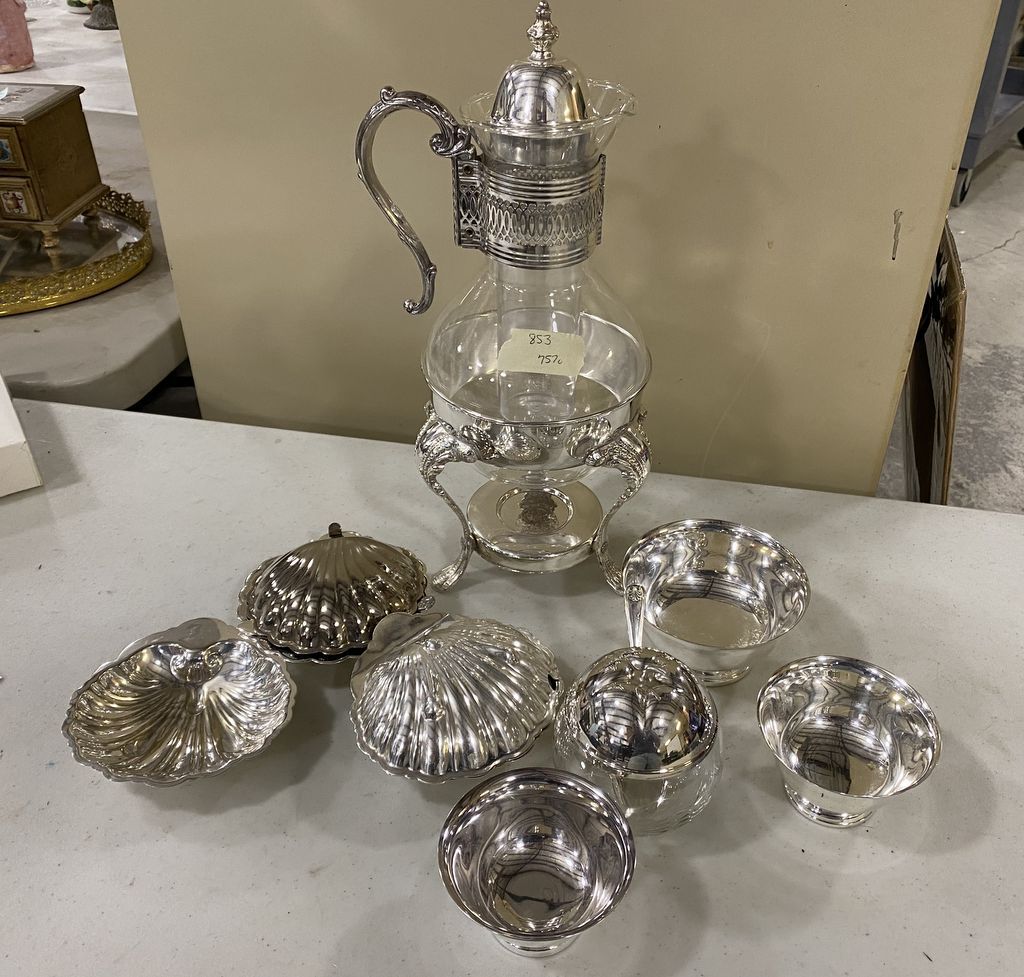 Silver Plate Shell Dishes and Silver Plate Carafe Pitcher. Location Left Plastic Racks Silver Plate Shell Dishes and Silver Plate Carafe Pitcher. Location Left Plastic Racks