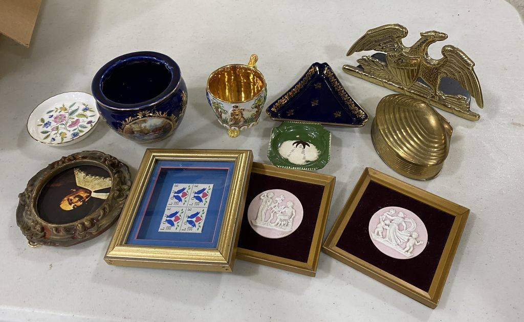 Decorative Porcelain and Plaques, brass bookend, shell trinket box, four picture plaques. Decorative Porcelain and Plaques, brass bookend, shell trinket box, four picture plaques.