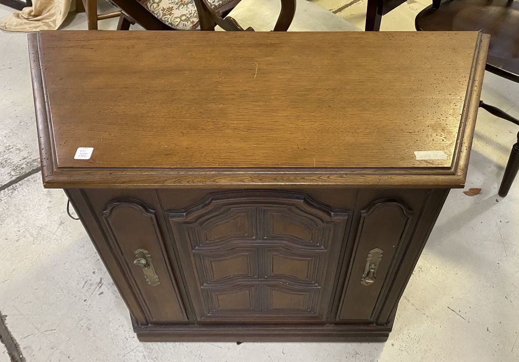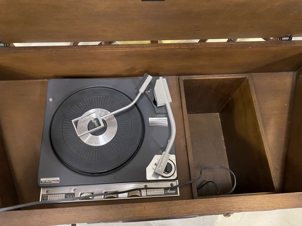 General Electric 300 Radio/Recorder Player Cabinet, lift top, untested, 27"h., 37"w., 18"d. Location 6th Row General Electric 300 Radio/Recorder Player Cabinet, lift top, untested, 27"h., 37"w., 18"d. Location 6th Row