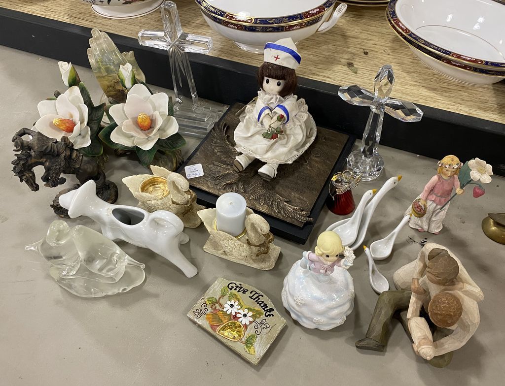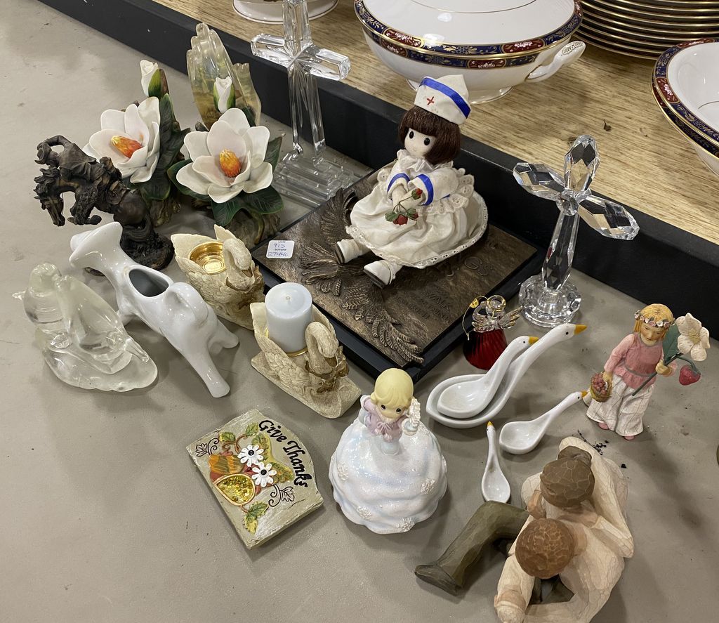 Group of Figurines, Porcelain, Glass Crosses, and Other Misc Items. Pair of Swan Candle Holders, Religious Eagle Plaque, Berkley Doll, Pair of Porcelain Flower Buds, Praying Hands, Willow Tree Couple and Baby "New Life" Figurine, Wildflowers Angels Strawberries for Goodness Girl Figurine, Precious Moments Action Musical "It Came Upon A Midnight Clear" Figurine Skating, Cordon Bleu Cow Dish, Set of Biscuit Anthropologie Nesting Ducks Geese Measuring Cups, and Other Misc Items. Location Right Metal Racks Group of Figurines, Porcelain, Glass Crosses, and Other Misc Items. Pair of Swan Candle Holders, Religious Eagle Plaque, Berkley Doll, Pair of Porcelain Flower Buds, Praying Hands, Willow Tree Couple and Baby "New Life" Figurine, Wildflowers Angels Strawberries for Goodness Girl Figurine, Precious Moments Action Musical "It Came Upon A Midnight Clear" Figurine Skating, Cordon Bleu Cow Dish, Set of Biscuit Anthropologie Nesting Ducks Geese Measuring Cups, and Other Misc Items. Location Right Metal Racks