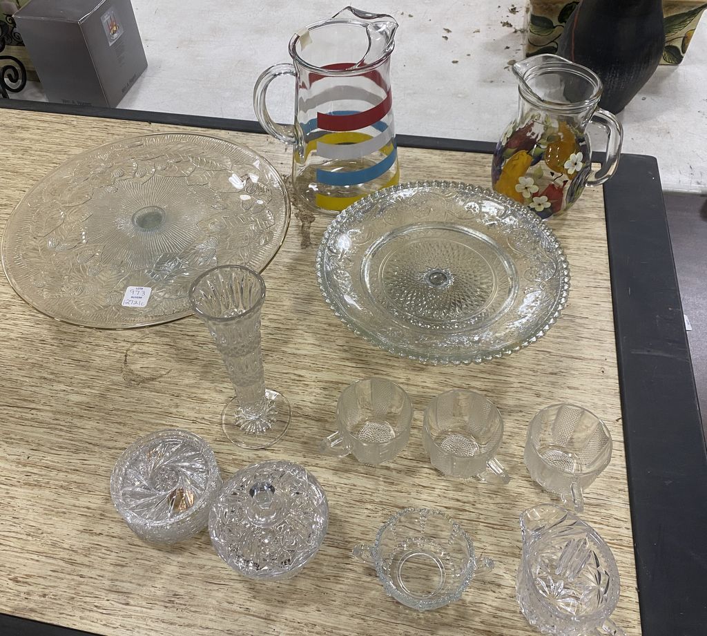 973 Group of Assorted Glassware, Cake Stands, 2 Pitchers, Set of Coasters, 3 Tea Cups, Bud Vase, and Other Misc Items