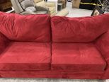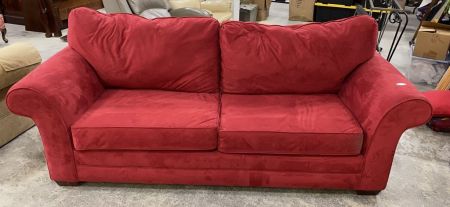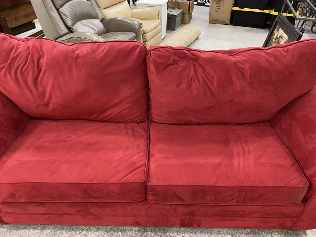 Red Upholstered Sleeper Sofa, used condition. Location 1st Row Red Upholstered Sleeper Sofa, used condition. Location 1st Row