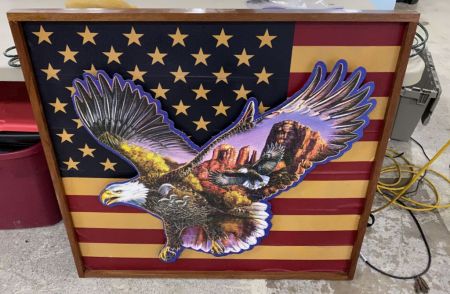 Framed American Flag with Eagle, 35"h., 36"w. Location Art Back Wall Framed American Flag with Eagle, 35"h., 36"w. Location Art Back Wall