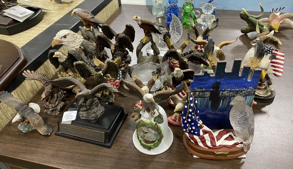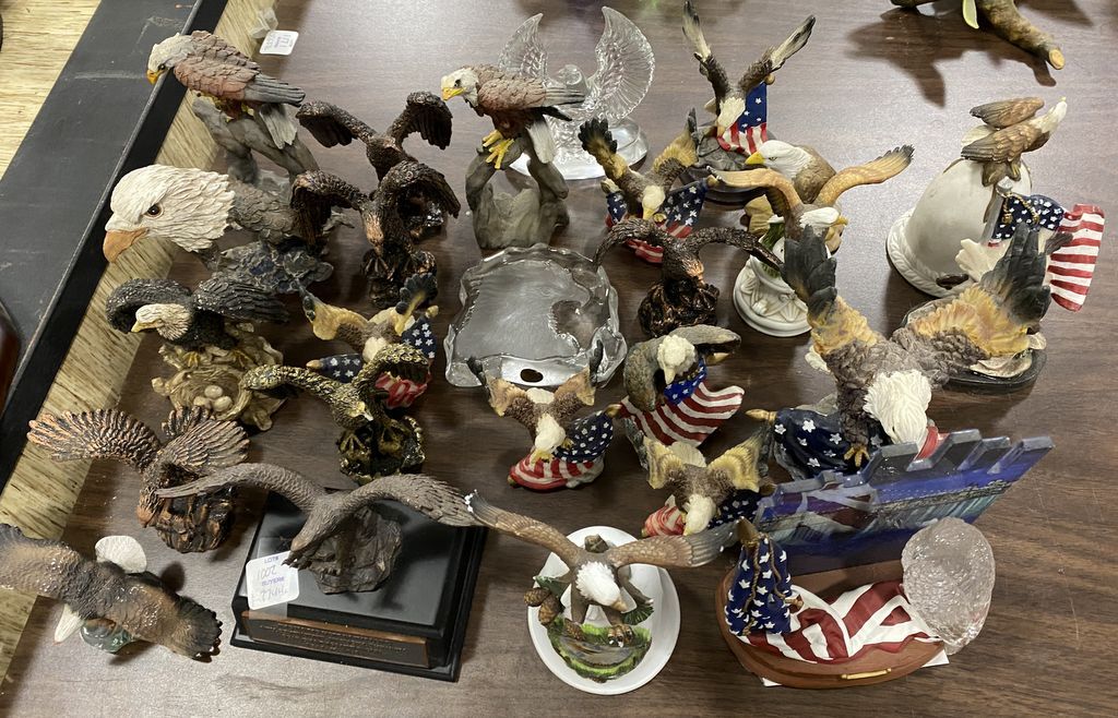 Collection of Small Resin Eagle Figurines, Location Left Back Metal Wall Shelves Collection of Small Resin Eagle Figurines, Location Left Back Metal Wall Shelves