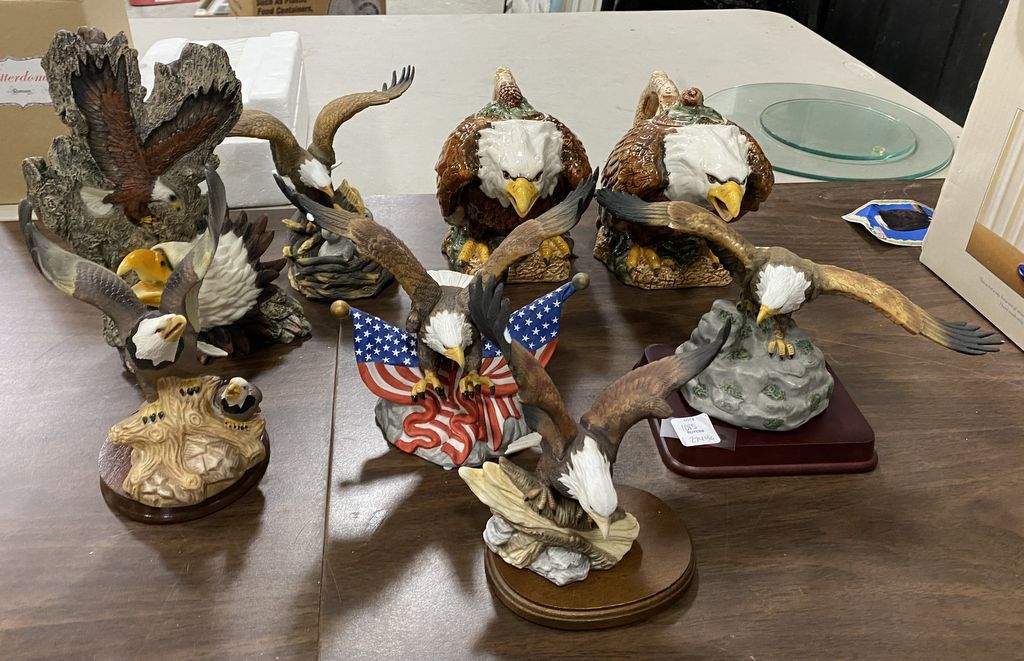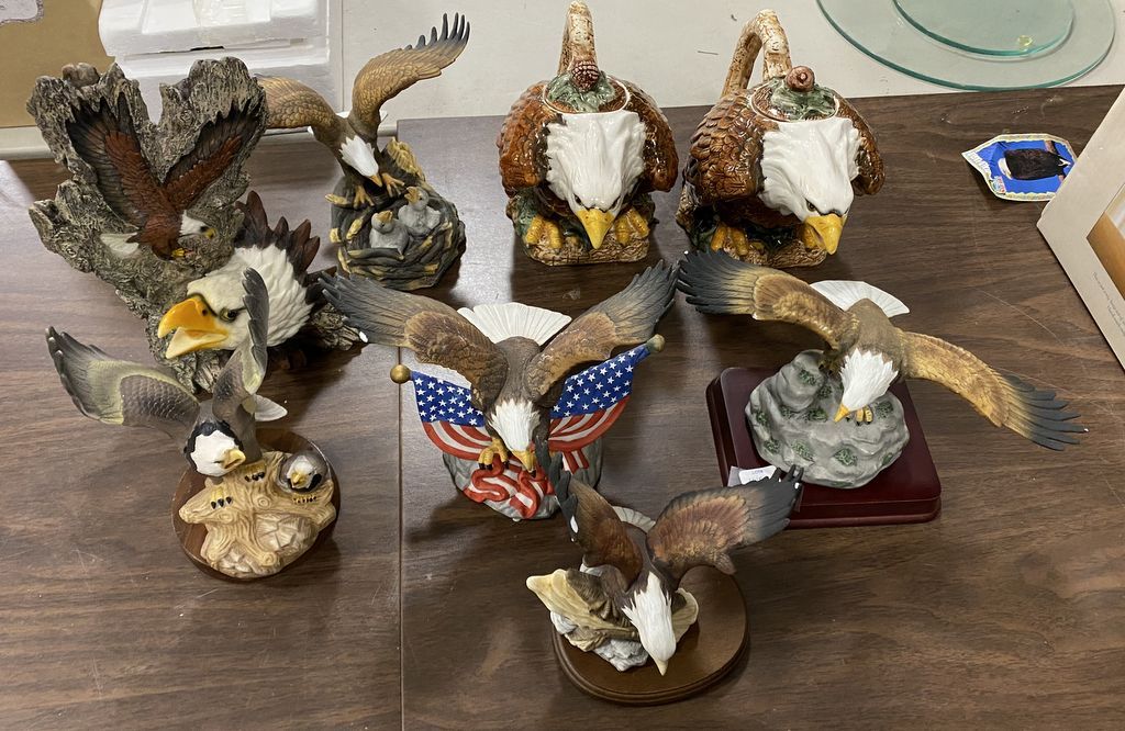 Group of Eagle Figurines and Ceramic Jars, Location Left Back Metal Wall Shelves Group of Eagle Figurines and Ceramic Jars, Location Left Back Metal Wall Shelves