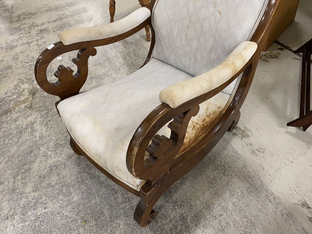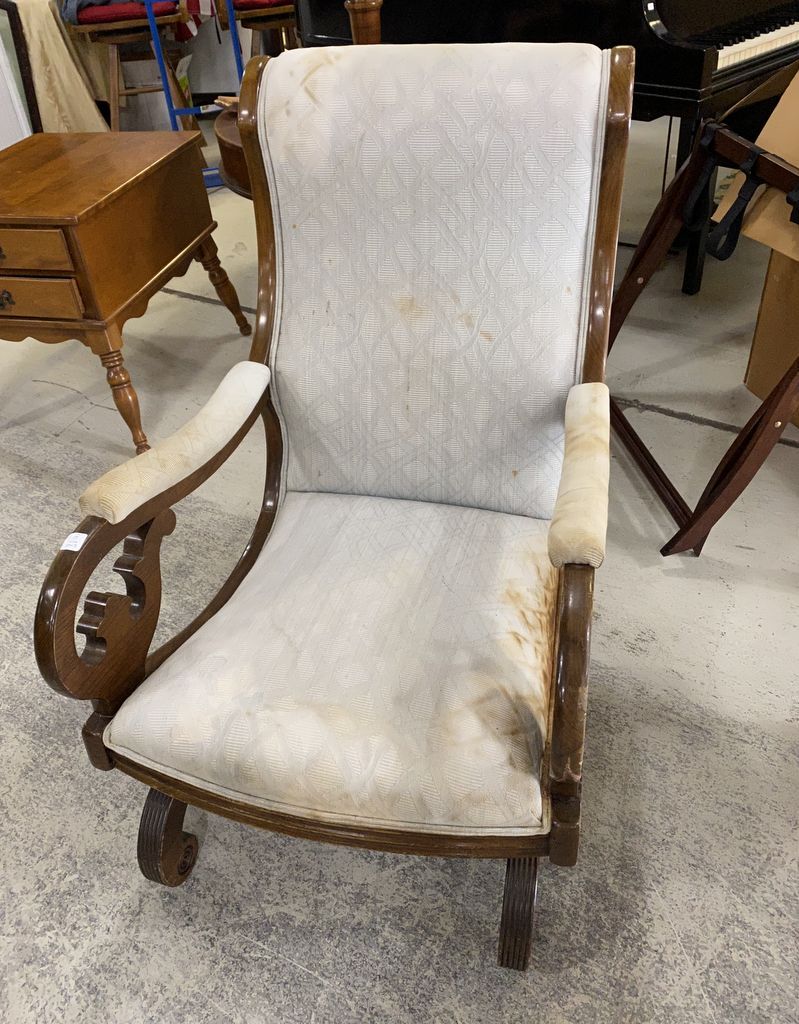 Cherry Wood Platform rocker, one arm damaged, stains on upholstery. Location Left Office Cherry Wood Platform rocker, one arm damaged, stains on upholstery. Location Left Office