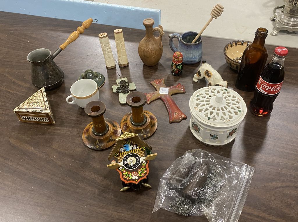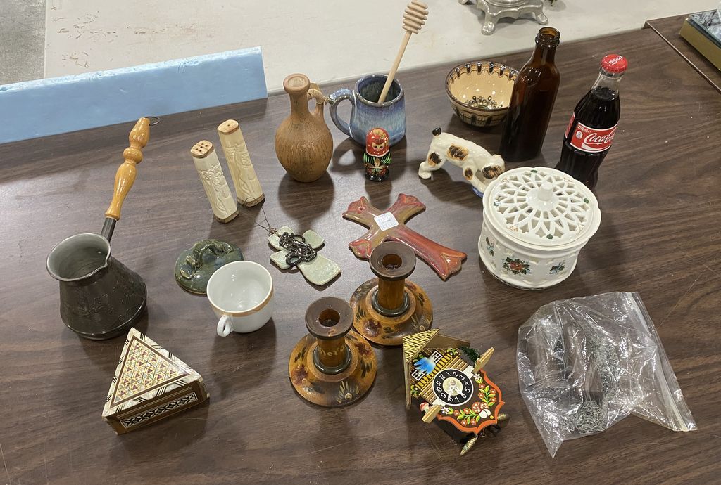 Group of Assorted Household Items. Includes Pair of Candle Stick Holders, Coca-Cola Bottle, Salt and Pepper Shakers, Porcelain Dog, Bowl, Armenian Turkish Coffee Pot Maker or Cezve, and Other Misc Items, Location Right Metal Racks Group of Assorted Household Items. Includes Pair of Candle Stick Holders, Coca-Cola Bottle, Salt and Pepper Shakers, Porcelain Dog, Bowl, Armenian Turkish Coffee Pot Maker or Cezve, and Other Misc Items, Location Right Metal Racks