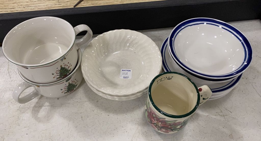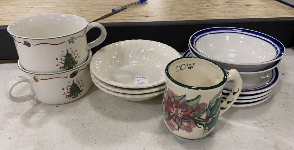 1158 Gibson Bowls, Gail Pittman Mug, Jingle Bells Soup Cups, and Three White Bowls