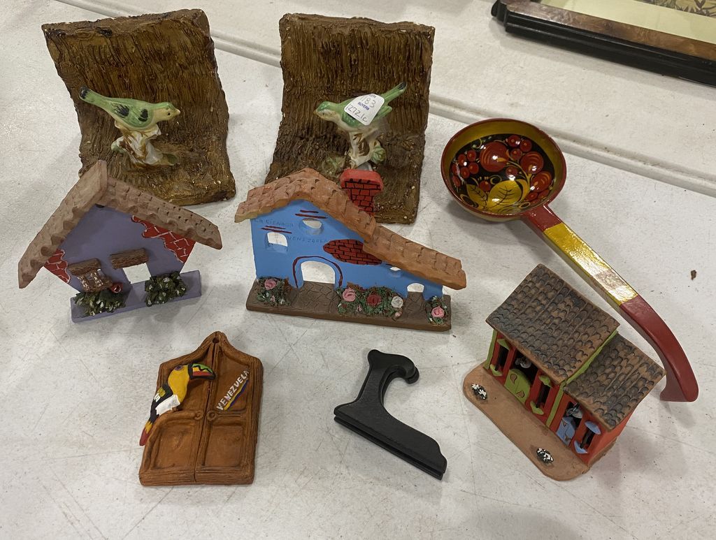 1183 Bird Figurine Bookends, Venezuelan Craftsmanship Clay Building Walls, and Other Misc Items