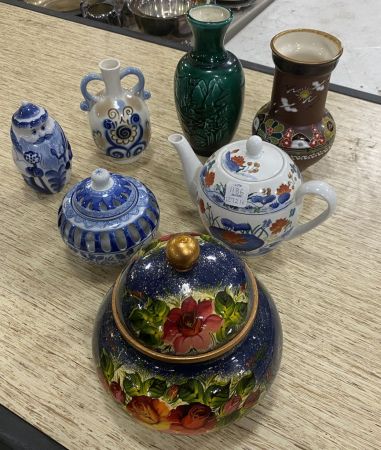 1186 Group of Assorted Items Includes Hand Painted Coffee Pot, Porcelain Potpourri Jar, 2 Vases, 1 Flower Bud Vase, and Other Misc Items