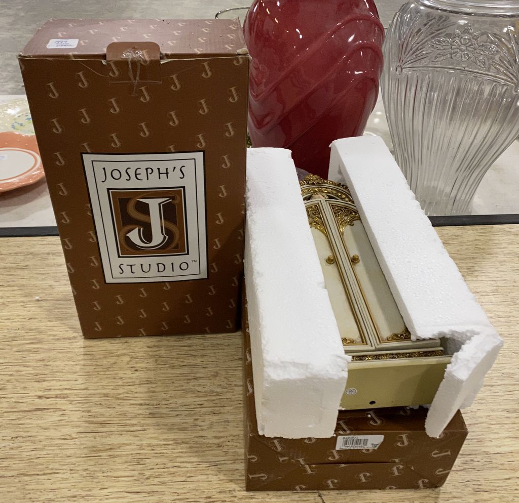 Two Jopeph's Studio Miniature Armoires, in boxes. Location Left Back Metal Middle Shelves Two Jopeph's Studio Miniature Armoires, in boxes. Location Left Back Metal Middle Shelves