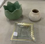 Tamara Childs Gold Metal Leaf Glass Tray, Camark Planter, B. Eigen Mini Vase Tamara Childs Gold Metal Leaf Glass Tray, Camark Planter, B. Eigen Mini Vase