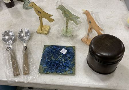 1271 Pair of Nautica Serving Spoons, 3 Iron Birds, Oval Covered Wooden Box, Decorative Tile