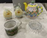 1272 Hand Painted Tea Pot, 2 Egg Ornaments, Enchanted Garden Mug, Crystal Glass Tray