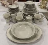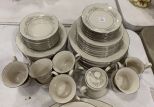 Nocturne Japan China Set, platter, plates, saucers, cups, sugar, creamer, bowls. Location Left Back Metal Middle Shelves Nocturne Japan China Set, platter, plates, saucers, cups, sugar, creamer, bowls. Location Left Back Metal Middle Shelves