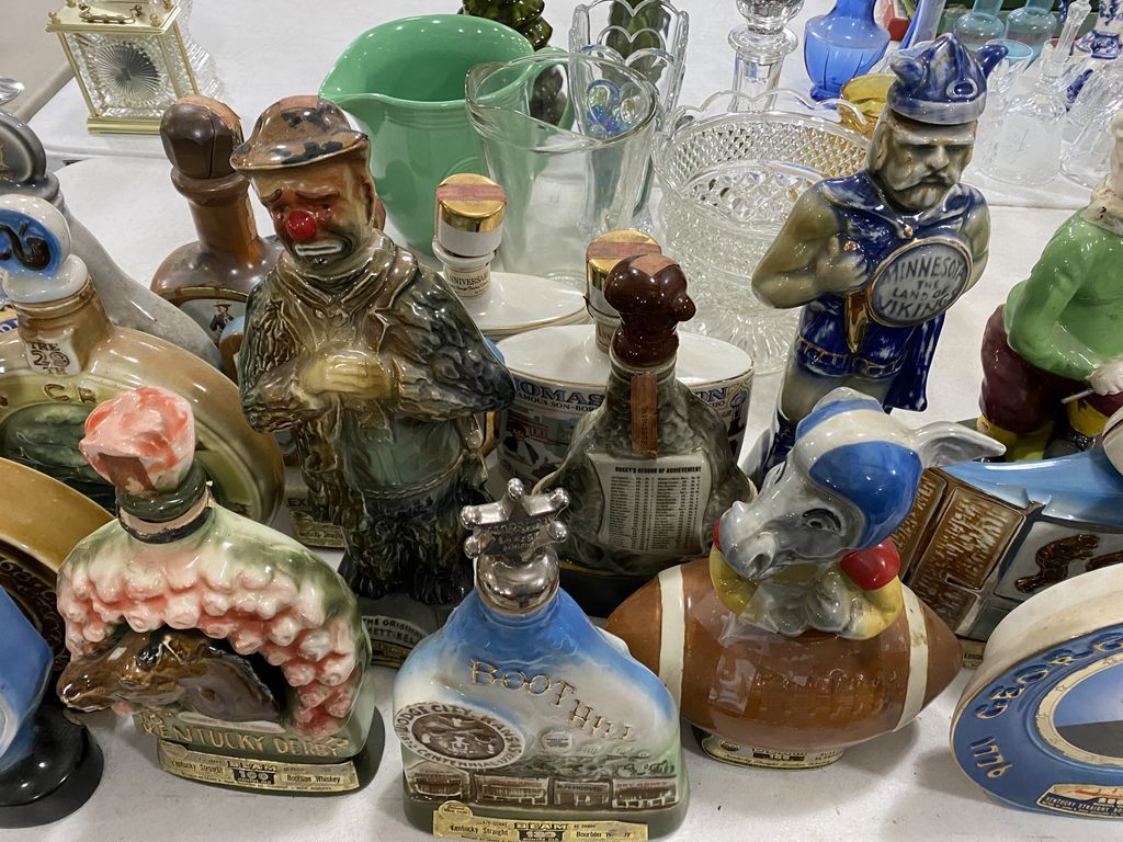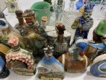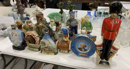 Large Collection Porcelain Decanters, different styles. Location Left Back Metal Wall Shelves Large Collection Porcelain Decanters, different styles. Location Left Back Metal Wall Shelves