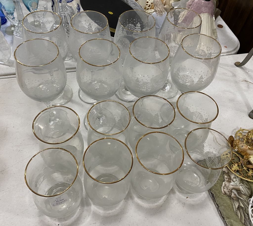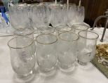 Gold Rimmed Stemware, 8 goblets, 8 cups, etched Christmas, Location Left Back Metal Wall Shelves Gold Rimmed Stemware, 8 goblets, 8 cups, etched Christmas, Location Left Back Metal Wall Shelves
