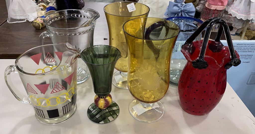 1342 Group of 3 Pitchers, Pair of Amber Candle Vases, Hand Painted Decorative Glass, Hand Painted Strawberry Handled Flower Vase