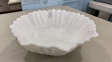 Vintage Imperial Milk Glass Ruffled Edge Bowl Grape Vine Pattern, Location Left Back Metal Middle Shelves Vintage Imperial Milk Glass Ruffled Edge Bowl Grape Vine Pattern, Location Left Back Metal Middle Shelves