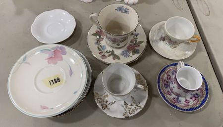 Grouping of Tea Cups and Saucers. Includes Gorham Fine China Tea Cup and Saucer, 1 Japan Porcelain Flower Tea Cup and Saucer, 1 Lefton China Tea Cup and Saucer, 1 Japan Porcelain Tea Cup and Saucer, 6 Saucers without Tea Cups Grouping of Tea Cups and Saucers. Includes Gorham Fine China Tea Cup and Saucer, 1 Japan Porcelain Flower Tea Cup and Saucer, 1 Lefton China Tea Cup and Saucer, 1 Japan Porcelain Tea Cup and Saucer, 6 Saucers without Tea Cups