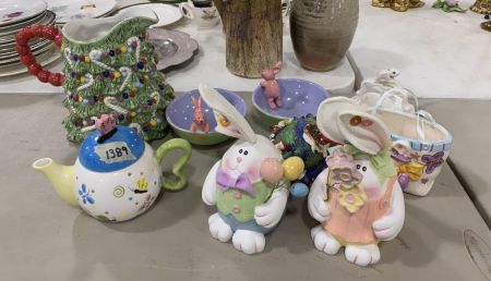 Grouping of Decorative Decor and Porcelain Includes Pair of Hand Painted Rabbit Figurines, Hand Painted Tea Pot with Lid, Decorative Christmas Tree Pitcher, Pair of Hand Painted Starbucks Coffee Spring 2007 Bowls with Rabbit, Christmas Tree Ball Ornament of Santas, Hand Painted Porcelain Carriage Planter Featuring Rabbit, Gracie China Porcelain Basket with Rabbit Handle, Location Left Back Metal Middle Shelves Grouping of Decorative Decor and Porcelain Includes Pair of Hand Painted Rabbit Figurines, Hand Painted Tea Pot with Lid, Decorative Christmas Tree Pitcher, Pair of Hand Painted Starbucks Coffee Spring 2007 Bowls with Rabbit, Christmas Tree Ball Ornament of Santas, Hand Painted Porcelain Carriage Planter Featuring Rabbit, Gracie China Porcelain Basket with Rabbit Handle, Location Left Back Metal Middle Shelves