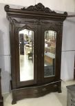 Antique English Oak Double Door Wardrobe, beveled mirrored doors, no key, two bottom drawers, crests, breaks apart, good condition, 92"h., 53"w., 17"d. Antique English Oak Double Door Wardrobe, beveled mirrored doors, no key, two bottom drawers, crests, breaks apart, good condition, 92"h., 53"w., 17"d.
