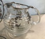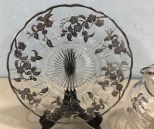 Vintage Pressed Glass Silver Plate Overly Serving Pieces, Pitcher, two under plates, floral designs overlay. Vintage Pressed Glass Silver Plate Overly Serving Pieces, Pitcher, two under plates, floral designs overlay.