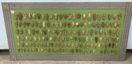 Collection of 158 arrowheads mounted to wood plaque, 48"h., 24"w. Collection of 158 arrowheads mounted to wood plaque, 48"h., 24"w.
