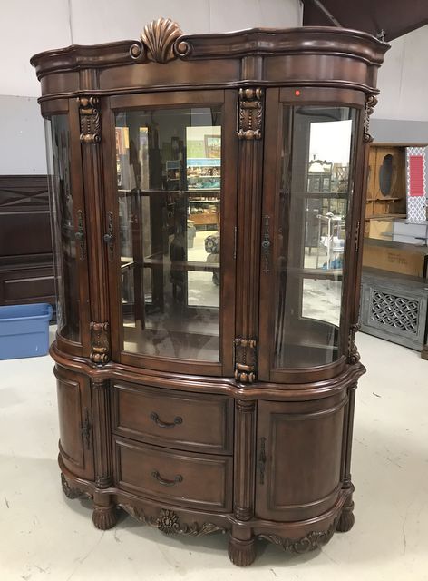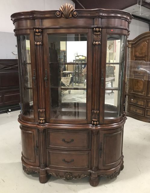 Large Modern Two Piece Cabinet, single glass door, side bow glass, glass shelves, three drawers, good condition. Large Modern Two Piece Cabinet, single glass door, side bow glass, glass shelves, three drawers, good condition.